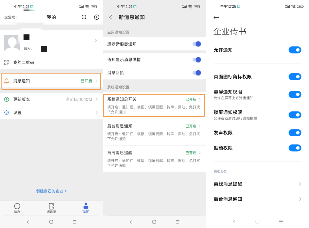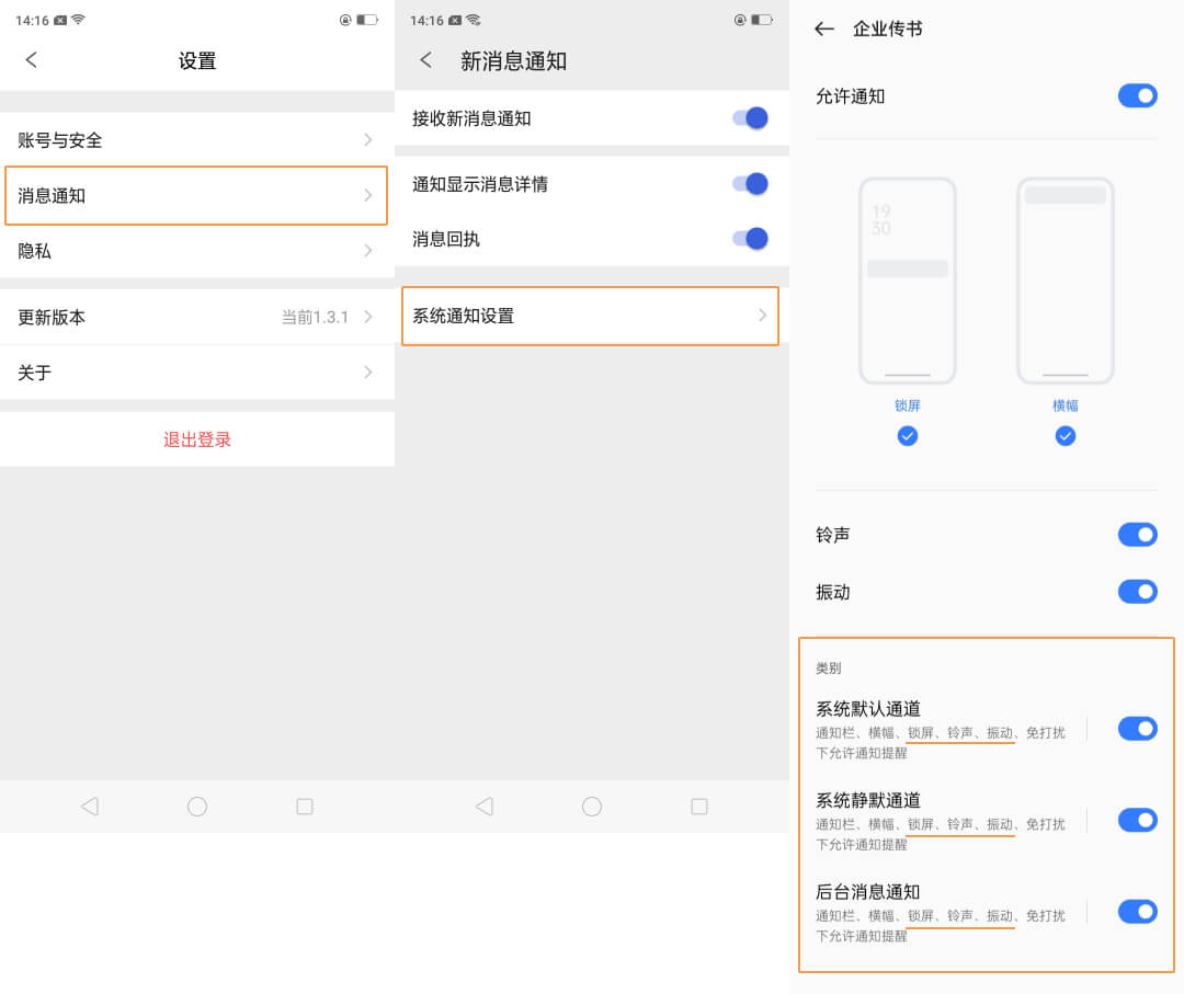 也可以在“企业传书”App 里找到 设置>消息通知>系统通知设置,打开它会到达手机系统的设置页面,再打开“通知”,再开启里面的各项通知功能即可。因为安卓手机型号极多,不同手机对于App的处理不一样,尤其注意打开“类别”之下的所有类型的通知的提示、声音、震动。