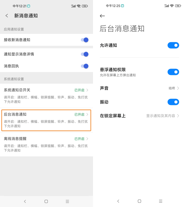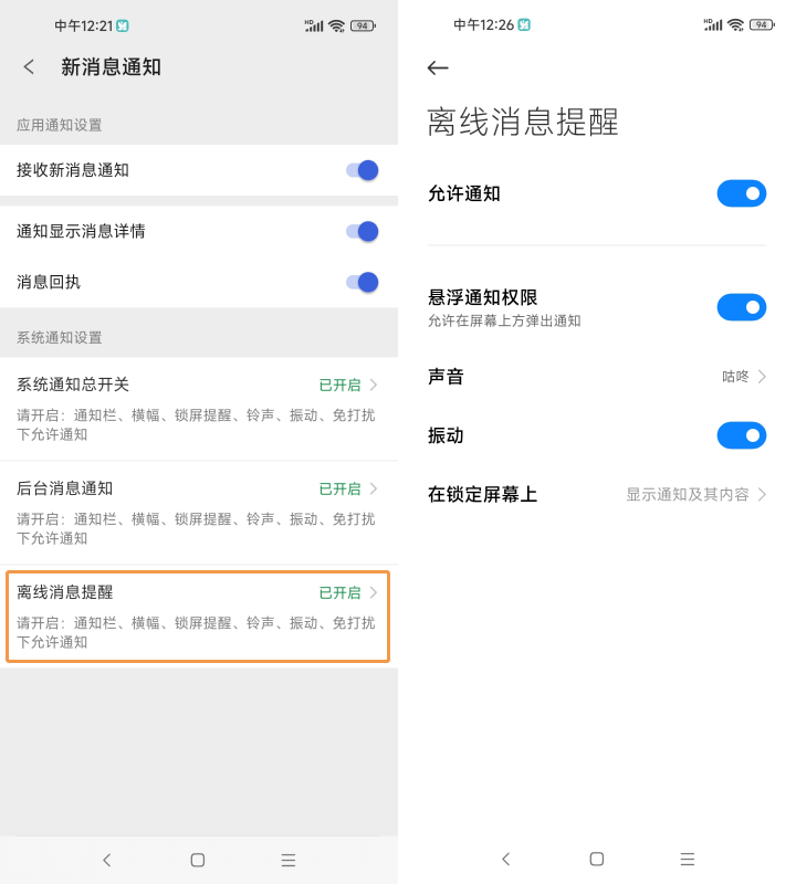 - 回到 我的>消息通知 点击 “离线消息提醒” ,将打开 App 的系统的 “离线消息提醒” 设置,请打开其中的所有消息提示功能。