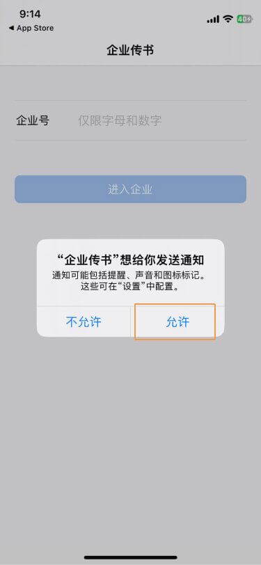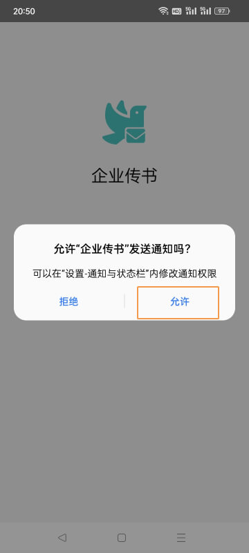 下载“企业传书”App 后启动,会自动弹出打开通知的询问弹框,请点击“允许”。