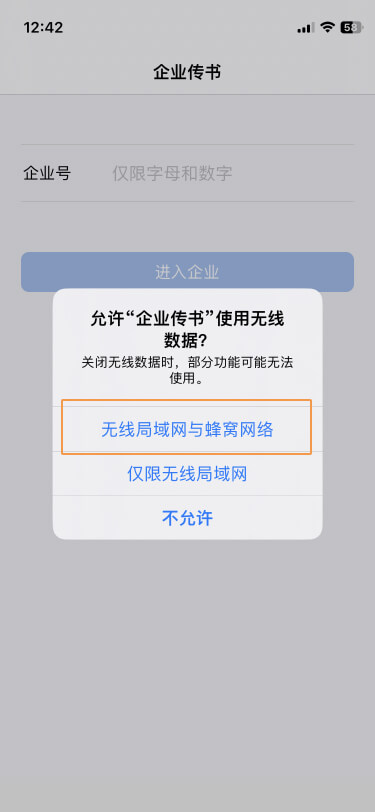 下载“企业传书”App 后启动,App会自动提示开启网络,此时请点击“无线局域网与蜂窝网络”即可。