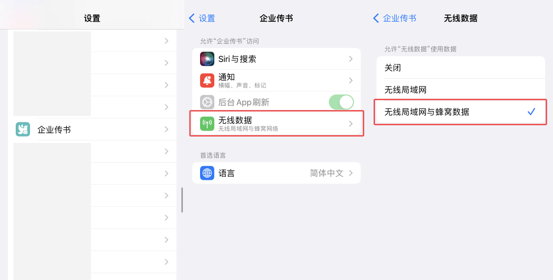 找到“企业传书”App,打开App的设置,再打开“无线数据”,选择“无线网络与蜂窝数据”。然后回到App即可继续使用。